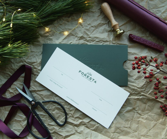 Vem vill du skämma bort med något extra? Vad köper man till någon som redan har allt? Ge bort en upplevelse på Villa Foresta! Det här presentkortet gäller som betalning för staycation med boende, frukost, lunch och middag. Vill du att presentkortet ska kännas lite extra lyxig? Beställ ett tryckt fysiskt presentkort i ett fint fodral, kostnad 95 kr inkl porto.